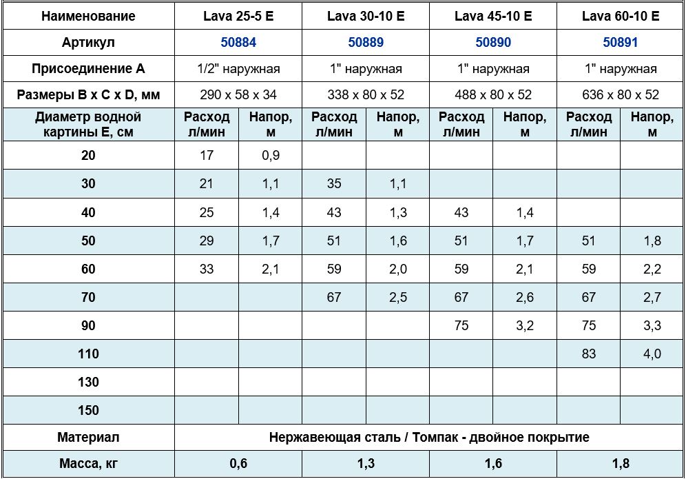 Насадки этой серии создают водную картину в форме колокола. Такой эффект считается наименее шумным, поэтому как нельзя лучше подходит для офисных помещений, садовых прудов и открытых бассейнов (при условии их защищенности от ветра). Красоту прозрачной водной вуали можно подчеркнуть подсветкой.